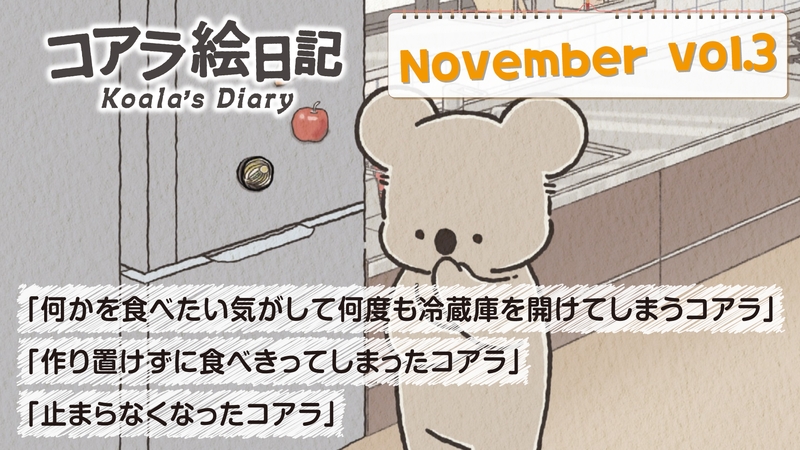 11月 Vol.3「何かを食べたい気がして何度も冷蔵庫を開けてしまうコアラ」「作り置けずに食べきってしまったコアラ」「止まらなくなったコアラ」