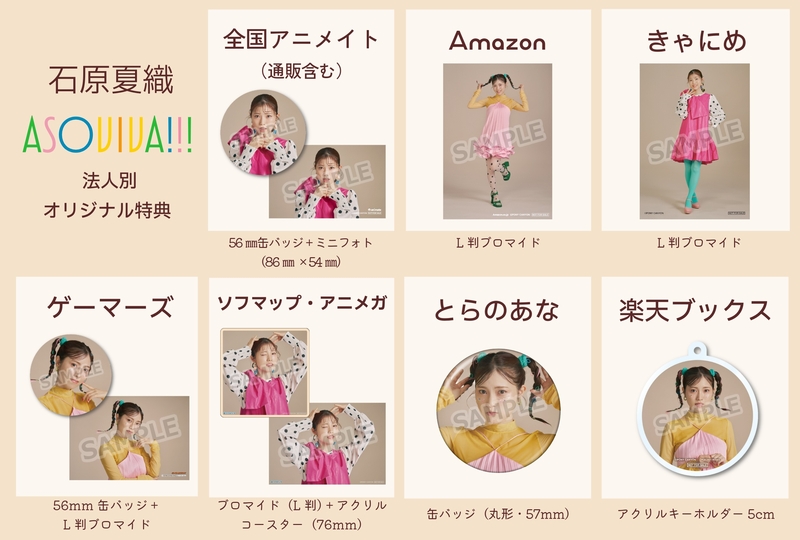 以下の販売店にて、石原夏織の2nd E.P 「ASOVIVA!!!」をご購入のお客様に、先着にてオリジナル特典をプレゼントいたします。数には限りがございますので、詳しくは各販売店にご確認下さい。